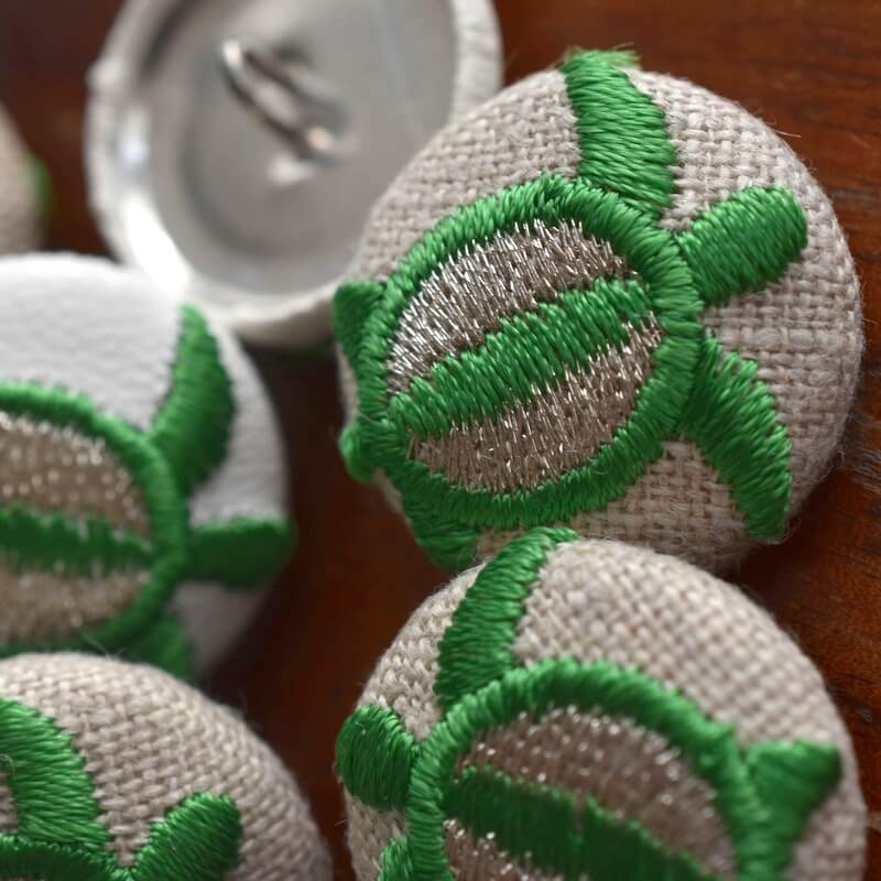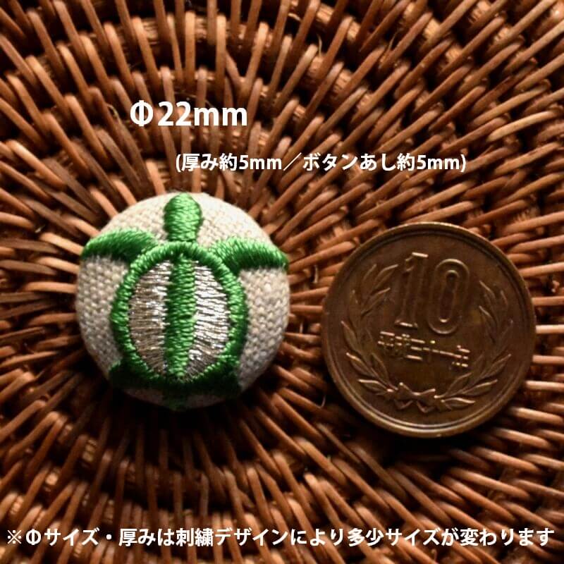 『ホヌ』刺繍のくるみボタンは直径22mm