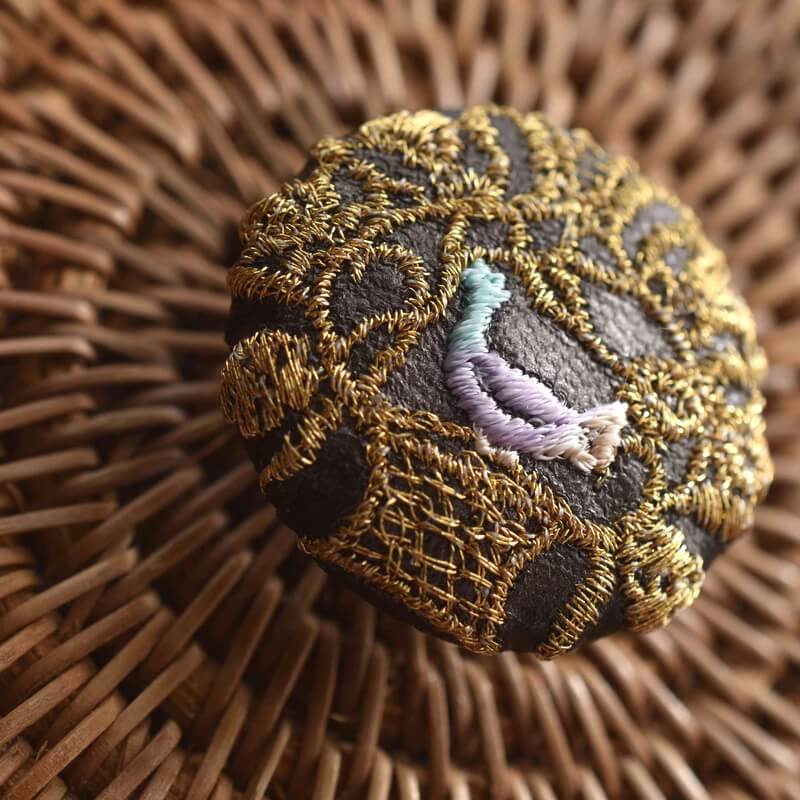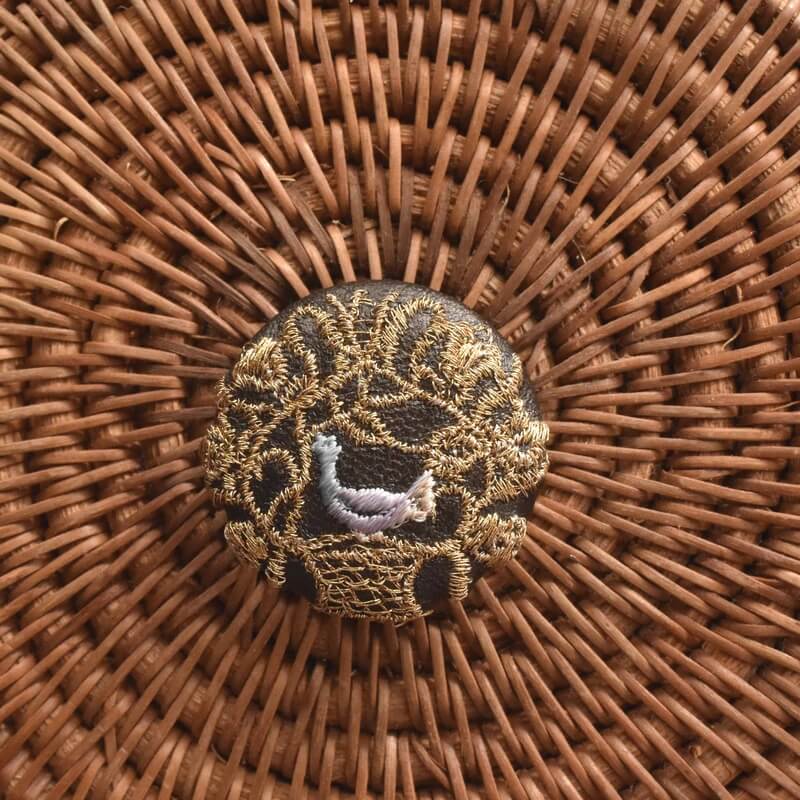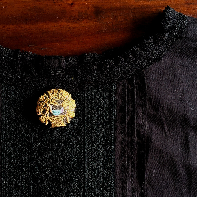 葛の中に閉じ込めた鳥の刺繍ボタン_ブローチピン