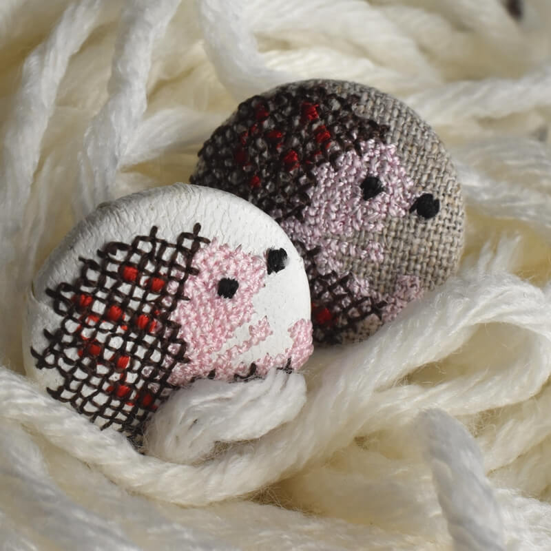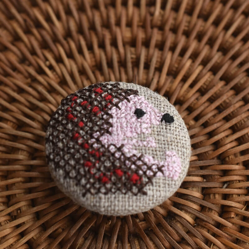 まるで針のコートを着ているかのようなハリネズミの刺繍ボタン_ブローチピン