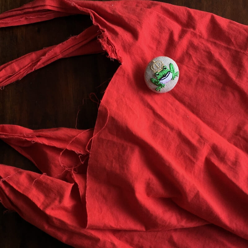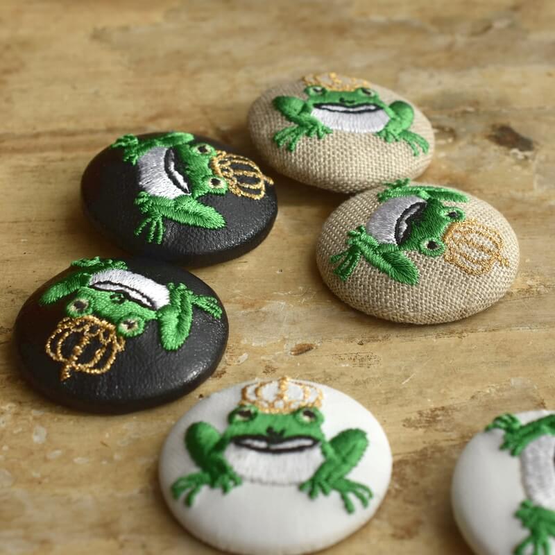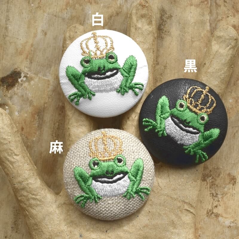 金の王冠をのせた[カエルの王様_Frog King]刺繍のくるみボタン