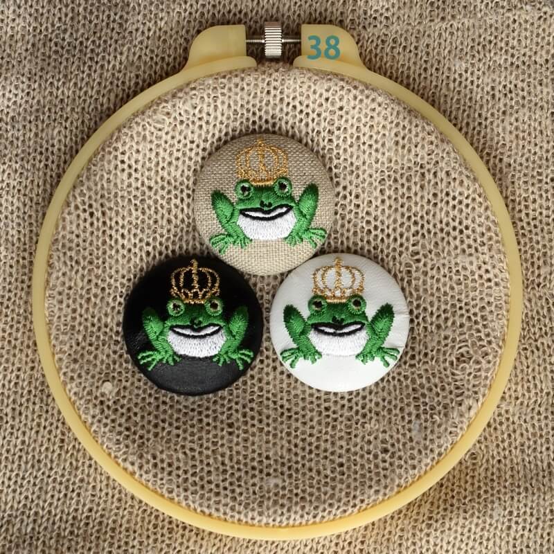 『カエル』刺繍のくるみボタンは直径38mm