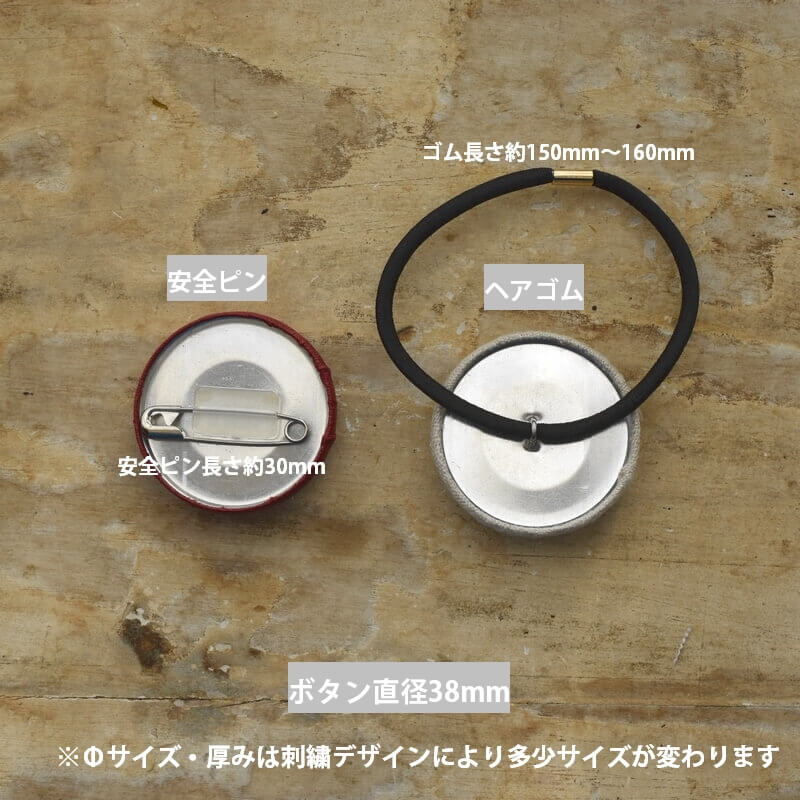 ミミ刺繍で作った直径38mmサイズの刺繍ボタンは「安全ピン付きバッチ」「ヘアゴム」のアクセサリーへ