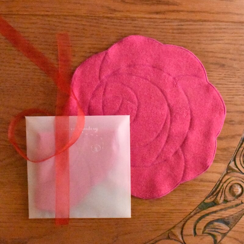 ラッピングは刺繍がみえるようにハンカチをたたんで袋に入れます