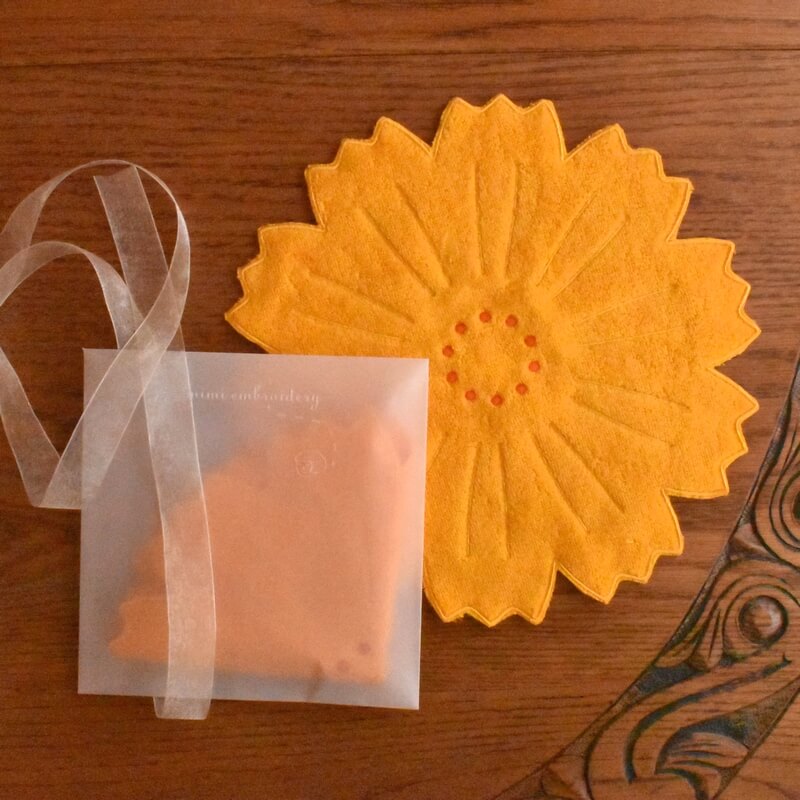 ラッピングは刺繍がみえるようにハンカチをたたんで袋に入れます