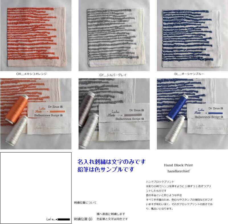 ハンカチと同色、例)オレンジ色ハンカチ→オレンジ糸色のネーム(名入れ)がオススメです(または、ベースの生地と同色糸色2500_シルクホワイト)